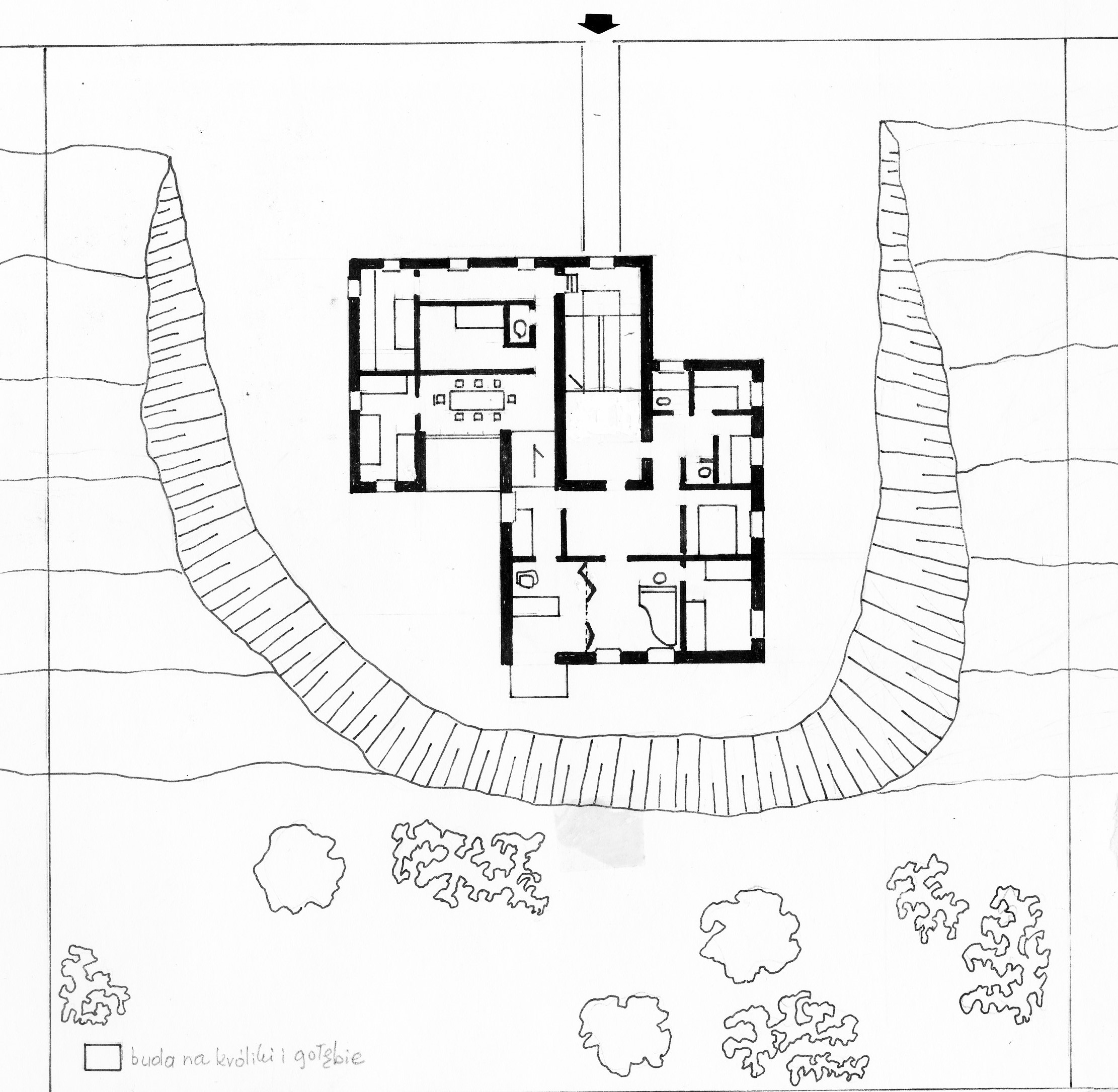 Nasza część była przykryta stropodachem, dlatego większość pomieszczeń miała lekko pochylone stropy. Wchodziło się do korytarzyka oświetlonego światłem wąskich okienek umieszczonych pod stropem. Korytarzyk prowadził na wprost do pokoju Arwida, zapewniając mu niejaką intymność, z czego chętnie korzystał. Od wejścia w lewo wchodziło się do krótkiego korytarzyka i do małej jadalni, z jego prawej strony był pokój Karinki, a na wprost, za jadalnią, rampa prowadząca do części górnej. Jadalnia miała duże oszklone drzwi wychodzące na balkon. Z jadalni wchodziło się do naszego - Erika, Runara i mojego, dużego pokoju ze stropem opadającym w dwóch kierunkach (było to pomieszczenie narożne).