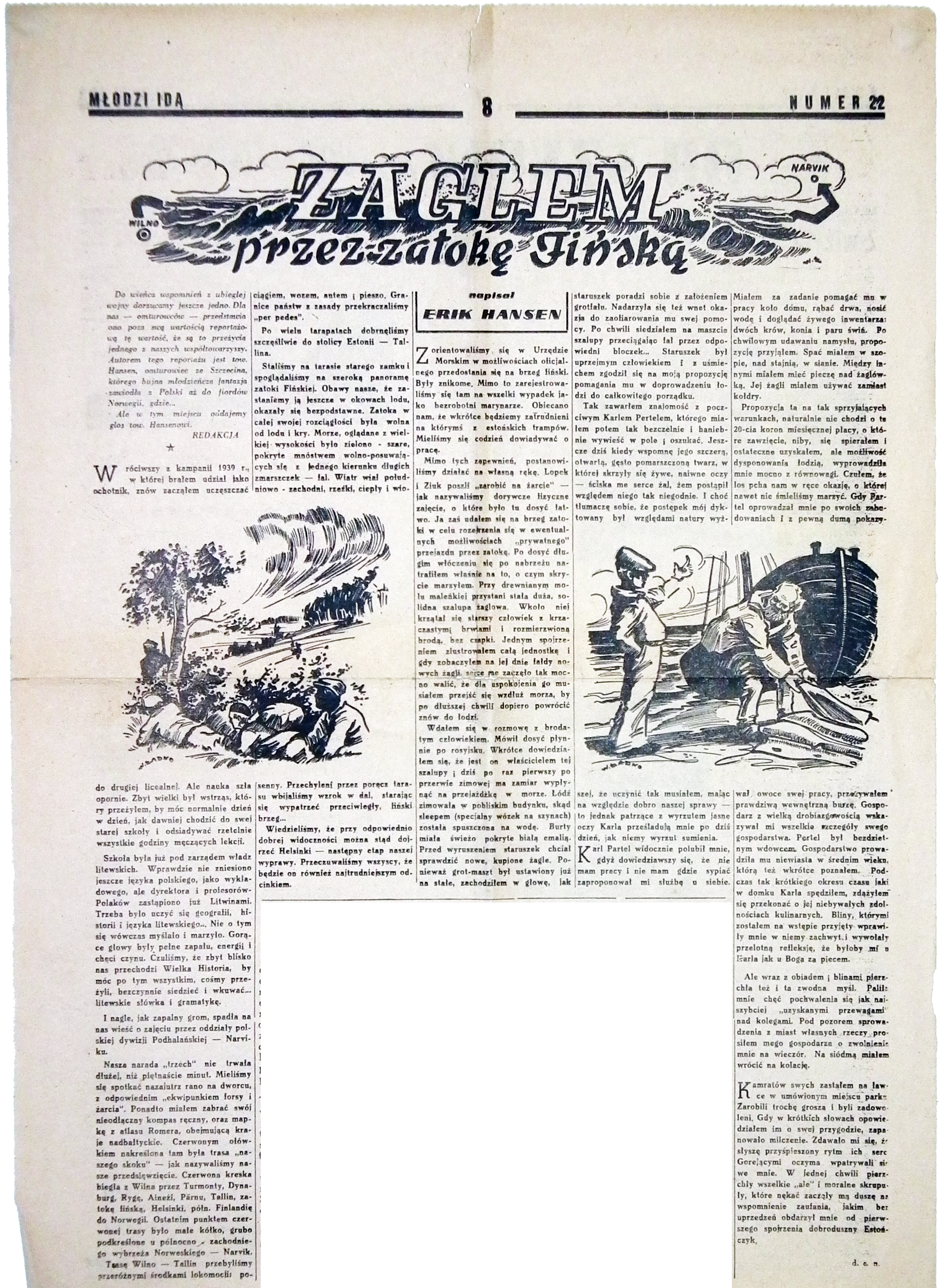 I nagle jak zapalony grom, spadła na nas wieść o zajęciu przez oddziały polskiej dywizji Podhalańskiej - Narwiku. Nasza narada “trzech” nie trwała dłużej, niż piętnaście minut. Mieliśmy się spotkać nazajutrz rano na dworcu, z odpowiednim “ekwipunkiem forsy i żarcia”. Ponadto miałem zabrać swój nieodłączny kompas ręczny, oraz mapkę z atlasu Romera, obejmującą kraje nadbałtyckie. Czerwonym ołówkiem nakreślona tam była trasa “naszego skoku” - jak nazywaliśmy nasze przedsięwzięcie. Czerwona kreska biegła z Wilna przez Turmonty, Dynaburg, Rygę, Ainezi, Pärnu, Tallin, Zatokę Fińską, Helsinki, półn. Finlandię do Norwegii. Ostatnim punktem czerwonej trasy było małe kółko, grubo podkreślone u północno-zachodniego wybrzeża Norweskiego - Narwik.