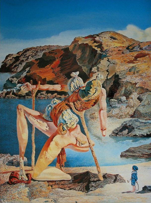 Drugi obraz, który wkładam do tego koszyczka, pochodzi z połowy lat trzydziestych, nasuwa refleksje dotyczące wojny, był jej przeczuciem, podobnie jak obraz de Chirico z lokomotywą wjeżdżającą na peron. Obraz Daliego to makabryczna, gigantyczna rzeźba z okaleczonego ciała wspartego na szczudłach, której przygląda się mały chłopczyk z kółkiem, w marynarskim mundurku.
