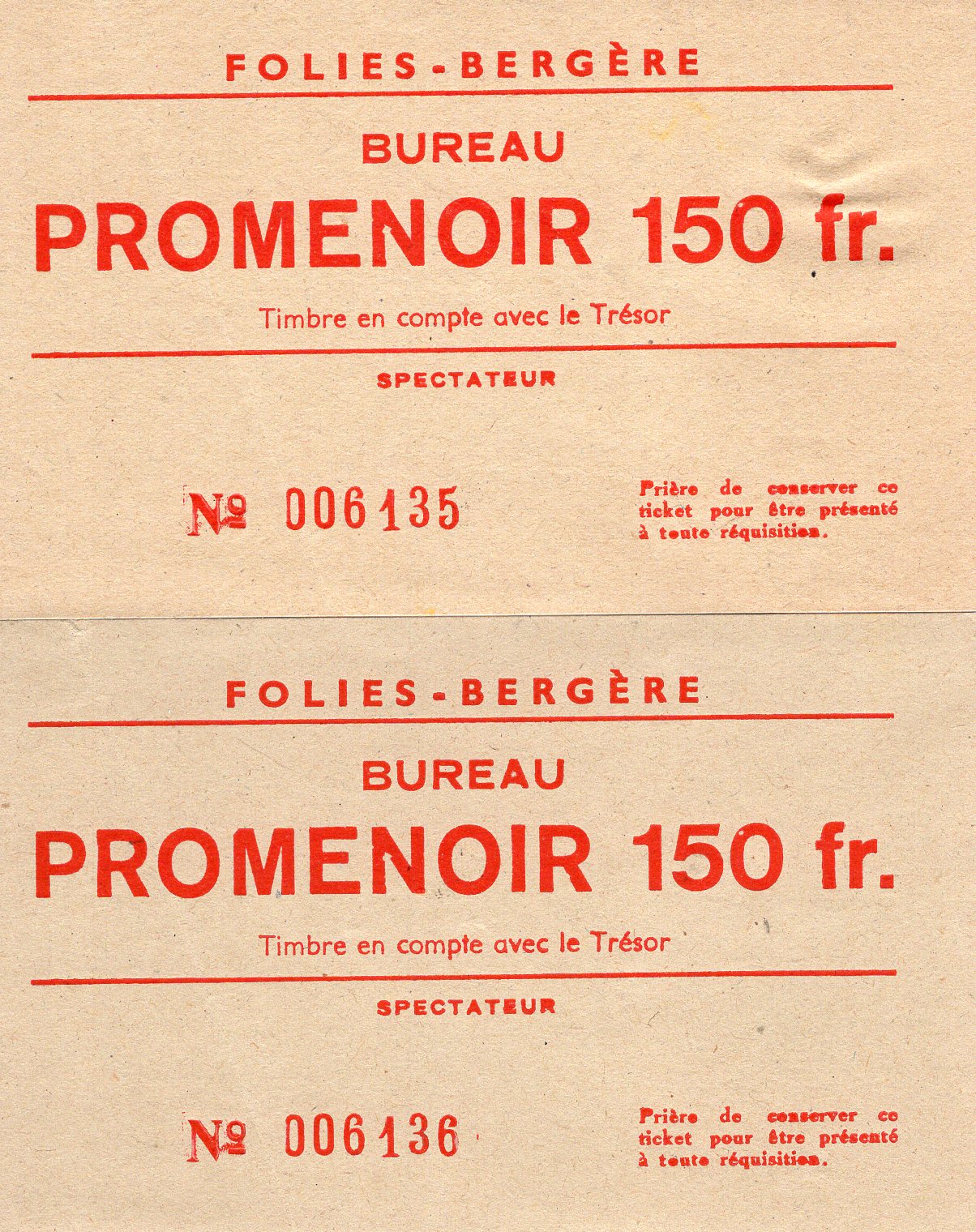 Nie mogliśmy również odmówić sobie pójścia do Folie Bergére ponieważ występowała tam wciąż jeszcze sławna Josephine Baker. Publiczność inna niż w L’Ambassadeur - bardziej swojska. Rewia. Wszystkie chwyty dozwolone, aby tylko było jak najbardziej oszałamiająco. Oczywiście schody, na schodach schody i schodki, a na tym tle dużo ruszającego się pierza i błyskotek. J. B. to również dużo, dużo piór i legenda. Był także kankan w czarnych pończochach, co natychmiast przywołało obrazy Degasa i Lautreca. W sumie nie podobało mi się, ale trzeba było to zobaczyć.